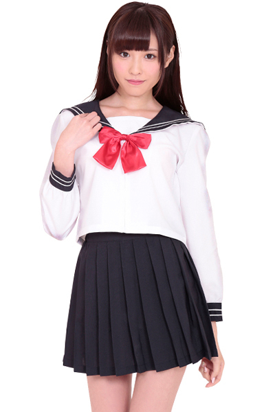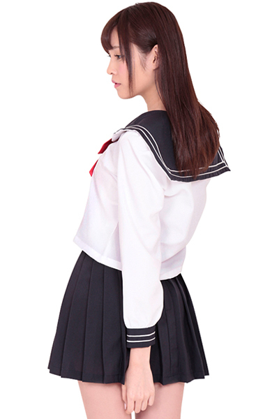 少しミニ丈なプリーツスカートは、清楚だけどどこかセクシー!紺×白に赤いリボンがマッチし、王道だけど可愛らしいセーラー服に仕上がっています。