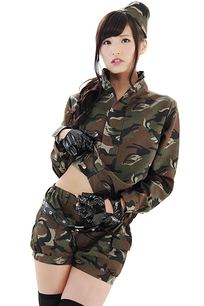 長袖ブルゾン&膝上パンツに、幅広ベルトをキュッと締めれば、ワイルドでセクシーな女兵士が完成!キャップと指無しグローブ付きのお得なコスプレ衣装です。