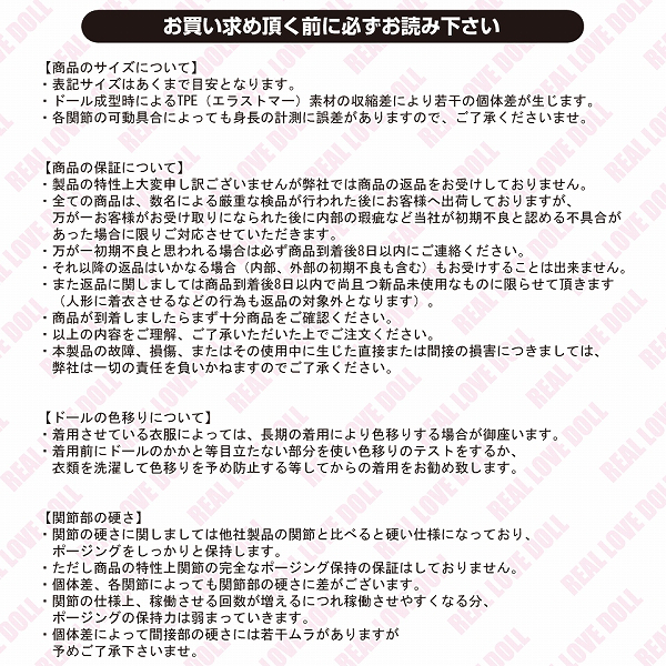 ●身長85cmのコンパクトなボディ●重さ5.5kgと軽量で移動も簡単●肉感的なエラストマー素材使用●B44・W34・H45とGOODバランス●人間の関節のように各所可動●髪は4種、瞳は3種から選択可能●髪…ロング黒・ロング赤・ショート金・ショートピンク●瞳…オレンジ・グリーン・ブルー●膣の奥行16cm(本体に成型済み)●お任せランジェリー一着付属●オーラルプレイはできません。