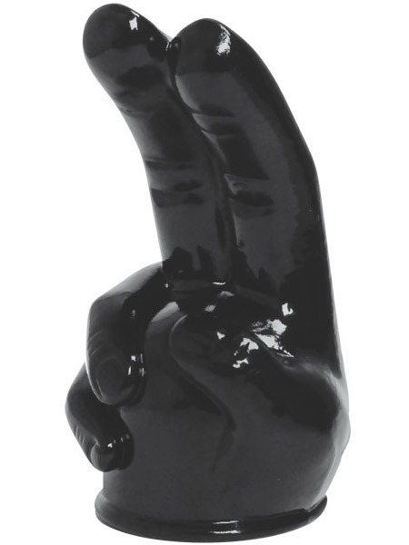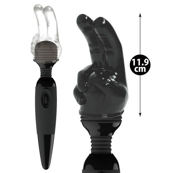 ●直径4.5〜5.2cmヘッドの電マに装着可能●大人の夜をアゲるブラックカラー●プニッと弾力のエラストマー素材●ピースサインのような二本指形状●角度をつけた指で手マン風プレイ●同型のクリアver(b24916)も。