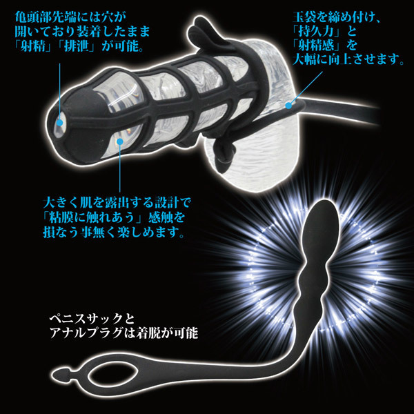 想像をはるかに超える未体験の絶頂感!メッシュ状ペニスサック+アナルプラグが合体した「PAアシストギア プラグ」。