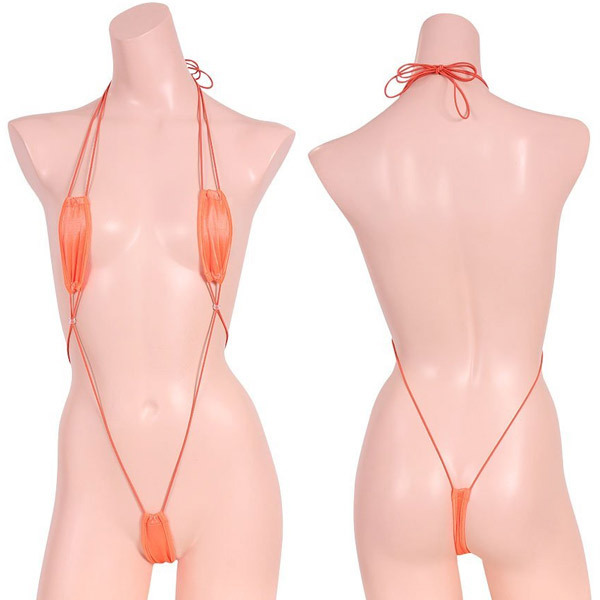 ギリギリ隠れる極小の縦長生地がセクシー!光沢感のあるサラっとしたストレッチ生地のサスペンダーテディ「極小光沢ストレッチプレイスーツ オレンジ」。
