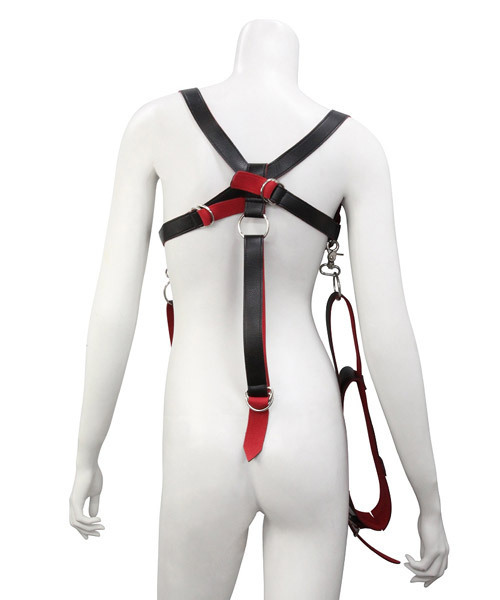 M字開脚を強制させて羞恥心を煽るSM用緊縛ベルト!背面のベルトで両腕を吊り下げられますが腕を完全に拘束するものではございませんので、手枷を別途ご用意頂くとより拘束感が高まります。