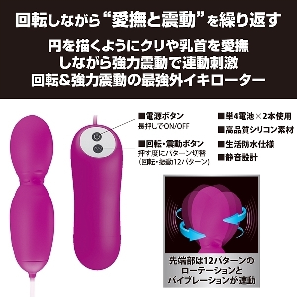 ローテーションと連動して震動する12パターンのバイブレーションで、直接性感帯を刺激すれば、火照った身体が跳ねあがる!!回転&強力震動の最強外イキローターです♪●12パターン振動●12パターンローテーション●高品質シリコン●生活防水