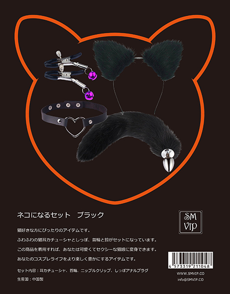 パッケージ:30.0×22.0×3.0cm 本体:耳カチューシャ約20cm×約20cm・首輪直径約12〜14cm・ップルクリップ(ハサミ口最大約1.6cm・長さ約5.6cm)・しっぽアナルプラグ直径約2.7cm・しっぽ長さ約40cm セット内容:耳カチューシャ、首輪、ニップルクリップ、しっぽアナルプラグ 原産国:中国 重量:本体135g