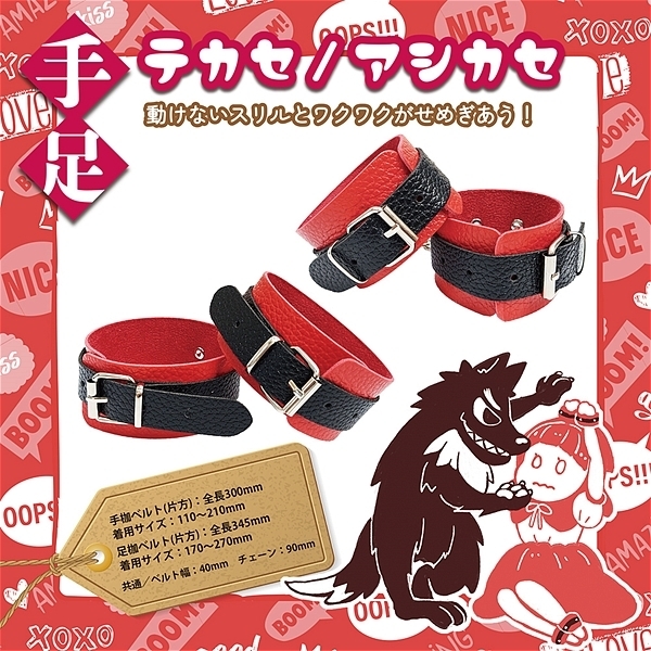 パッケージ:17.0×26.0×7.0cm 本体:@アイマスク(マスク部分8.5×20.5cm、フリーサイズ、素材:ゴムひも)、A口枷(ベルト全長61.0cm・ボール直径4.0cm・着用サイズ40.0〜54.0cm)B手枷(ベルト全長30.0cm・幅4.0cm・チェーン9.0cm・着用サイズ11.0〜21.0cm)C足枷(ベルト(全長34.5cm・ベルト幅4.0cm・チェーン9.0cm・着用サイズ17.0〜27.0cm)Dリード付き首輪(ベルト全長50.0cm・ベルト幅4.0cm・着用サイズ32.0〜40.0cm・リード100cm)E拘束ロープ(長さ4m65cm・太さ0.75cm・素材:組紐)Fバラ鞭(全長53.0cm・鞭32.0cm・持ち手12.0cm)