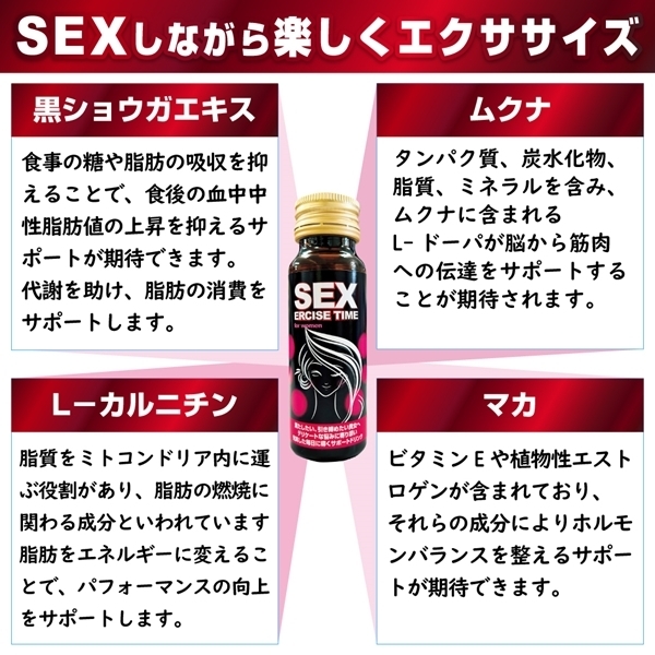 心身ともに自分を高めたい貴女のためのサポートドリンクです♪業界初の「セクササイズ」を実現しました!黒ショウガエキス末、マカエキス末、ムクナエキス末、L−カルニチンフマル酸塩の4つの厳選成分を配合しています♪毎日にメリハリをつけたい方にぴったりのドリンクです!悩みに向き合いたい方、理想の自分に近づきたい方にもおすすめ♪SEXERCISE TIMEは、身も心もスッキリとした充実した日々を目指し、愛情とハリのある毎日へと導きます。