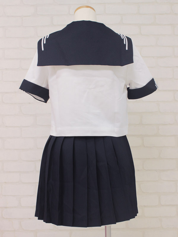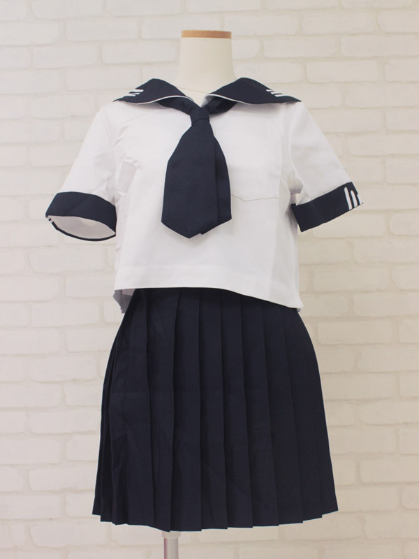 半袖セーラーブラウス、プリーツスカート、紺色スカーフのセットです!セーラー襟と袖に入った、個性的な白ラインがお洒落なお嬢様風制服コスプレです。