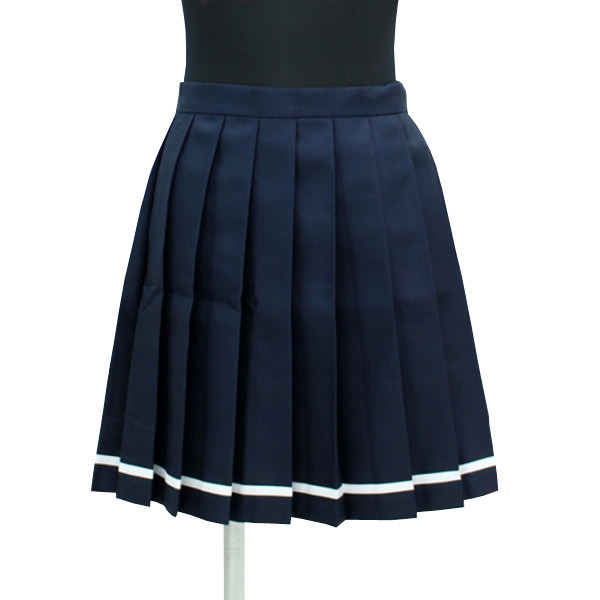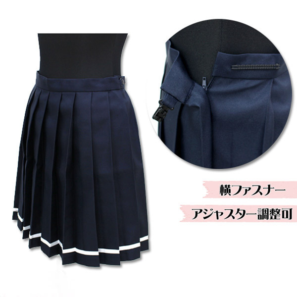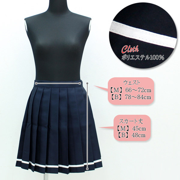 Mサイズ:W66〜72cm スカート丈45cm セット内容:スカート単品(横ファスナー、アジャスター調節可) 素材:ポリエストル100% 無地プリーツスカート単品 色:紺×白ライン