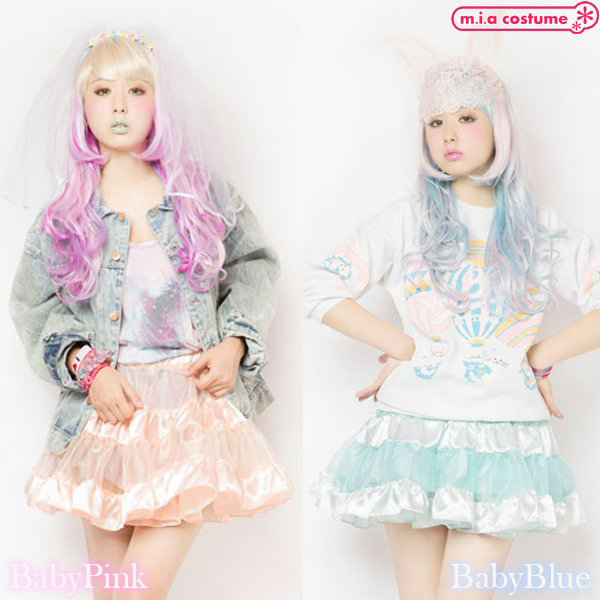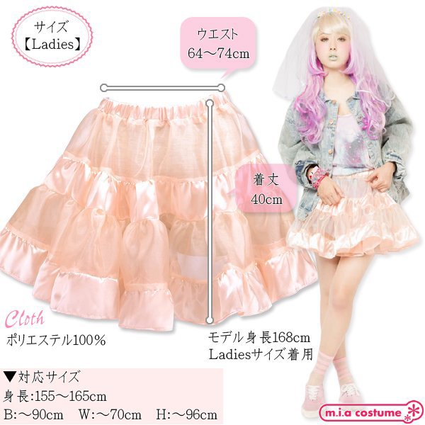 イベント用のコスプレやパーティー用としても良さげなコスプレです♪サテンの光沢感とシースルー素材の組み合わせがとても可愛いティアードスカート!重ねるボトムスで様々なコーディネイトを楽しみつつ、甘いベビーピンクが優しい印象を与えてくれます♪ふんわり広がるガーリィな印象とシルエット。