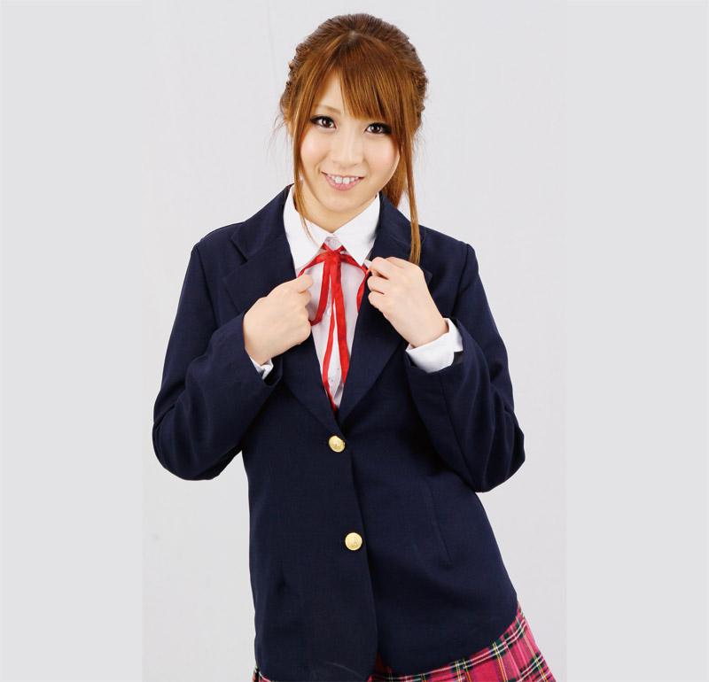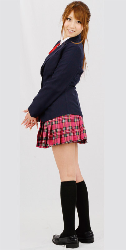 リボン付きブラウス、ブレザー、スカート、さらにハイソックスまでセットになった充実の制服コスプレです。