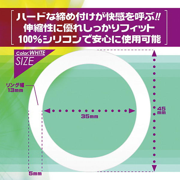 内径約3.5cmと大きめなリングは、伸縮性に優れた100%シリコンでつくりあげているので、どんなサイズのペニスにも相性抜群!持続力&勃起力に期待できる男性補助グッズです。