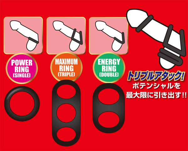商品内容はドーナツ型のシングルタイプと2点締めのダブルタイプ、そして3点締めのトリプルタイムと3種類のリングがセット!適度な柔軟性と締め付けが期待できる素材はピュアシリコン製。