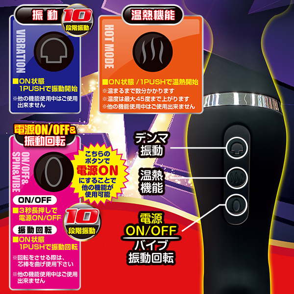 ボディ素材はシリコンでマットな肌ざわりにくわえ、10段階の重厚感ある振動が楽しめて生活防水仕様だからメンテナンスもラクチン♪グリップ部分が細くなっているので女性でも持ちやすいです。