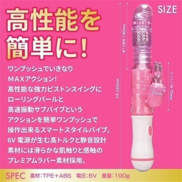 ワンプッシュでいきなりMAXアクション!強力ピストンスイング+ローリングパール・高速振動サブバイブという高性能アクションをワンプッシュで操作出来るスマートスタイルバイブでです。