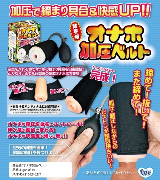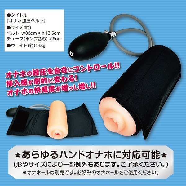 お使いのオナホに巻くだけで締まり具合を自在に調整できるサポートグッズです♪ベルトを巻いて空気を入れるだけの簡単操作で、内部に圧をかけられます!加圧することで挿入感が変化し、刺激の質を自分好みにカスタマイズできます♪スカスカに感じていたオナホも、締まりのある肉厚仕様に変身します!すでに満足していたオナホも、加圧によってさらに快適な使用感が得られます♪空気の出し入れもワンタッチで簡単に操作可能です!多くのハンドタイプオナホに対応する巻き幅で、汎用性も抜群です♪挿入・加圧・解放のサイクルを繰り返すことでトレーニングとしても使用できます!本体は軽量で扱いやすく、収納や持ち運びにも便利な仕様です♪自分だけの締まりポイントを見つけて、新しいオナホ体験を楽しみましょう♪