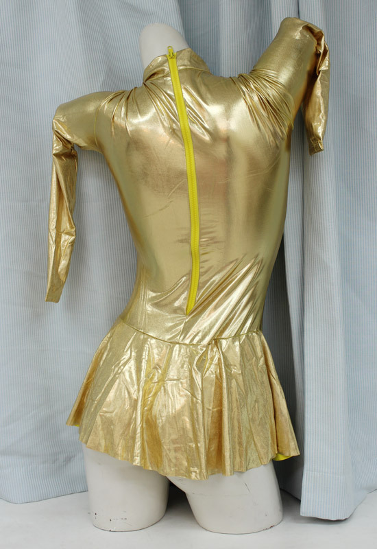エナメル製のように光沢のある、キラリと輝くゴージャスなゴールドカラー!伸縮性があるので、ピッチリとしたバストやクビレが美しいボディラインを引き立てます!ひらりと軽いスカートから覗く、ハイレグとヒップラインがとってもセクシーなコスチューム!背中のファスナーで脱着衣が可能です。
