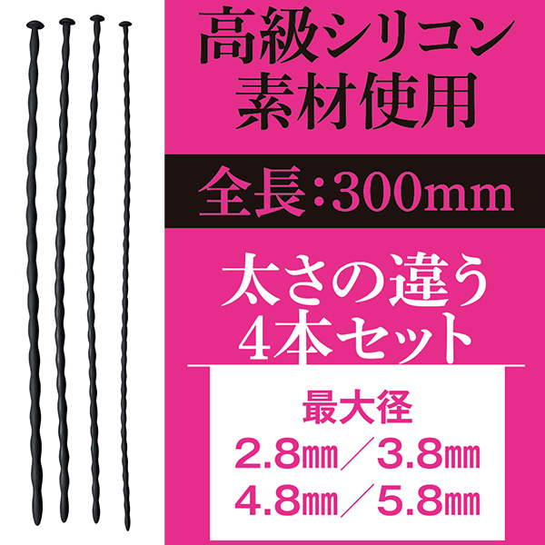 あなたの尿道を覚醒させるシリコン製の「極細シリコンプラグ」!それぞれ太さの違うシリコンカテーテルの4本セット♪長さが十分あるので本格的なサウンディングプレイをお楽しみいただけます!4サイズともにそれぞれ径が違いますが、ビギナーからでも始められそうなサイズ感となっております♪先端部分は先細で挿入しやすく、表面にはデコボコ加工が施され、底部はストッパーになっているので安心感もあります。
